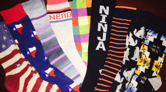I now own probably 20 pairs of sock that are not interchangeable. US Flag socks, TX Flag socks, colorful socks, Star Wars socks, Ninja socks, Nerd socks (a personal favorite of mine), amongst others. My socks have driven at least as many conversations as my cuff links. The point?