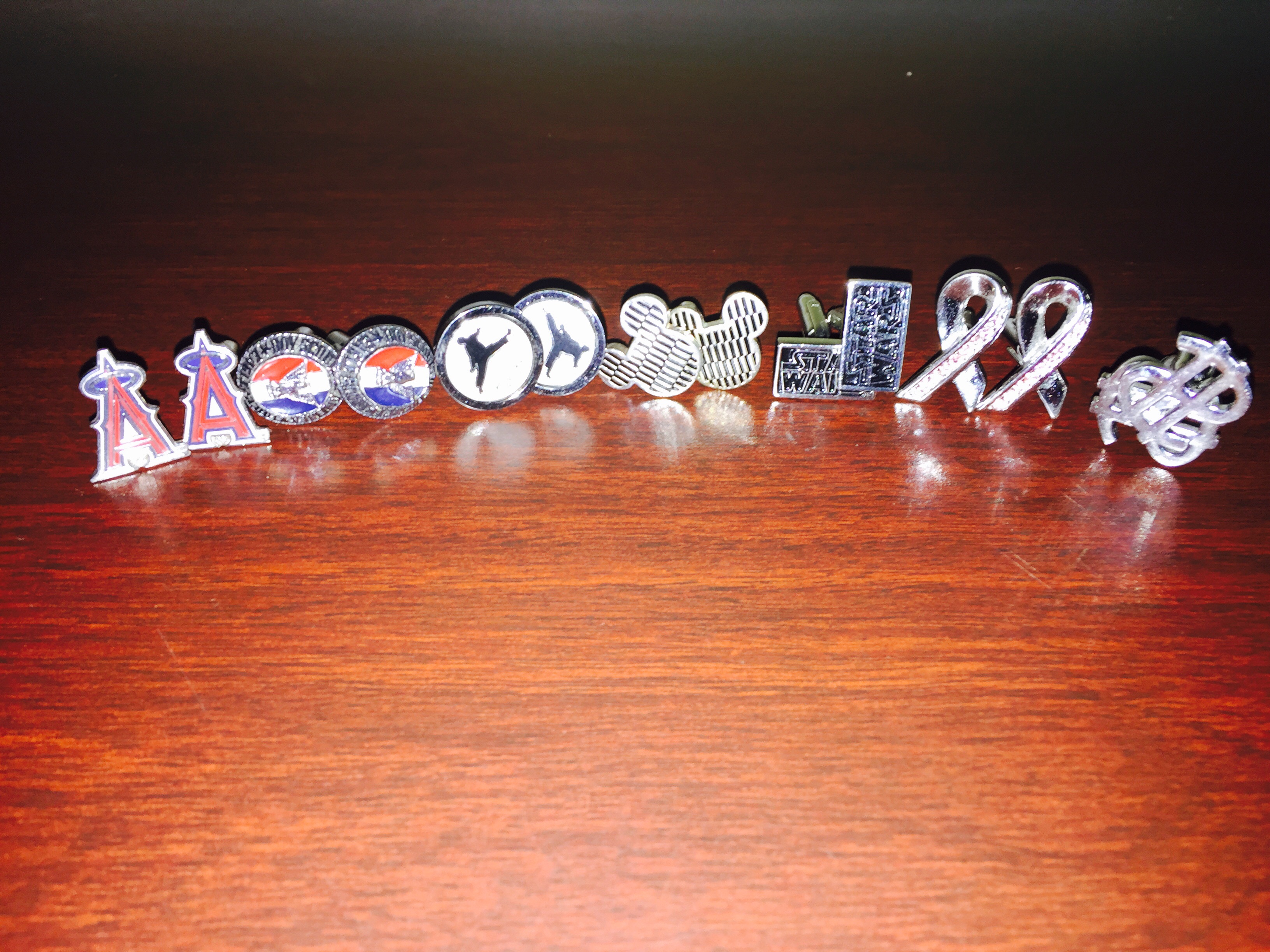 I wear cuff links that mean something to me and socks that will drive conversation. In the above picture, each pair of cuff links represents something that means something in my life (even the $$ cuff links as I represent a software system that maximizes revenue). Eagle Scout, Star Wars fanatic, Disney fanatic, Black Belt, Angels Fan and husband to a Breast Cancer Survivor. They all define me…..or at least explain me.
