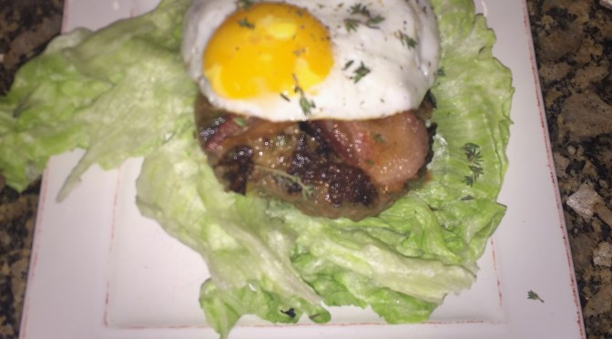 - Plate burgers on either lettuce leaves or buns of your preference and top with 2 pieces of bacon and fried egg.